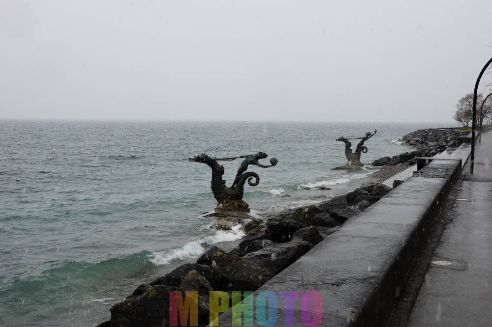 레만호수에 있는 모형물 내가 온 반대편에는 개그맨 중 유명한 개그맨 브베에서 생을 마감을 한 찰리 채플린에 동상 그리고 커다란 포크가 있지만 점점 더 많이 오는 눈으로 인하여 갈 수가 없는 상황이라 보지 못하고 가는 걸 포기를 하였다. 이 길을 쭉 따라가면 스위스 글로벌 식품회사인 네슬레 본사가 위치를 하고 있는 곳인데 어떻게 생겼나 구경이라도 해볼까 했는데 눈도 많이 오고 하여 다시 브베역으로 돌아간다.