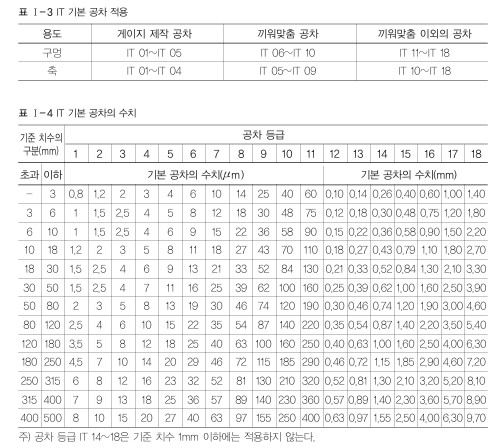 IT 기본 공차는 치수 공차와 끼워맞춤에 있어서 정해진 모든 치수 공차를 의미하는 것으로 국제표준화기구(SO) 공차 방식에 따라 분류하며, IT 01~ IT 18까지 20등 급으로 나누고 정밀도에 따라 표 I-3과 같이 적용한다.