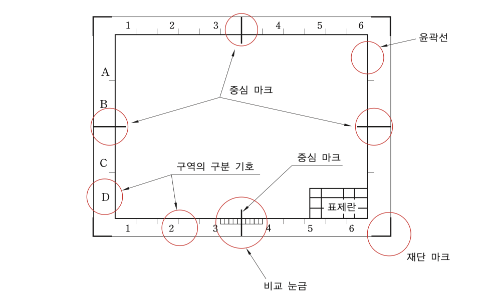 도면을 읽거나 관리하는 데 편리하도록 표시하는 비교 눈금, 도면의 구역을 표시하 는 구분 기호, 재단 마크를 표시한다.