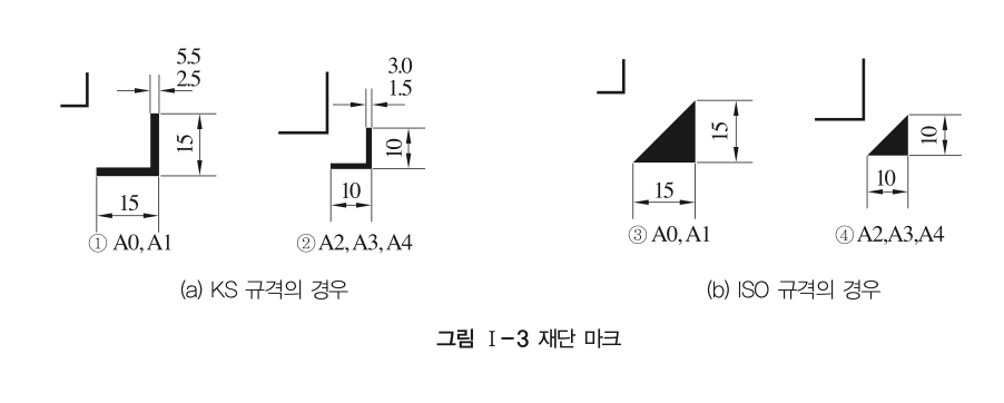 재단 마크는 인쇄, 복사, 또는 플로터로 출력된 도면을 규격에서 정한 크기로 자르 기에 편리하도록 원도에 그림 I-3과 같이 그린다.