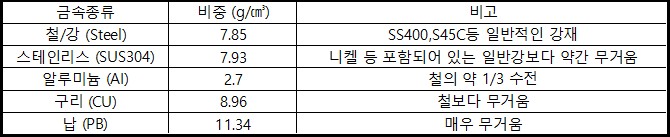 금속마다 밀도가 다르기 때문에, 재질이 바뀌면 곱해주는 비중 값도 달라져야 합니다.